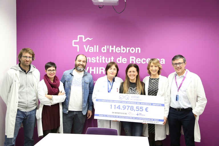 Asdent (Associació de la Malaltia de Dent) ha fet entrega de 114.978,55 euros al Vall d’Hebron Institut de Recerca (VHIR) per continuar investigant en aquesta malaltia. La patologia de Dent és una malaltia minoritària d’herència lligada al cromosoma X i que es caracteritza per alteracions del túbul proximal renal que resulten en proteïnúria, hipercalciúria i nefrocalcinosi. Els malalts expulsen per l’orina les proteïnes, el fòsfor i la glucosa que el cos necessita. Tot això fa que evolucionin cap a malaltia renal terminal i fibrosi.
