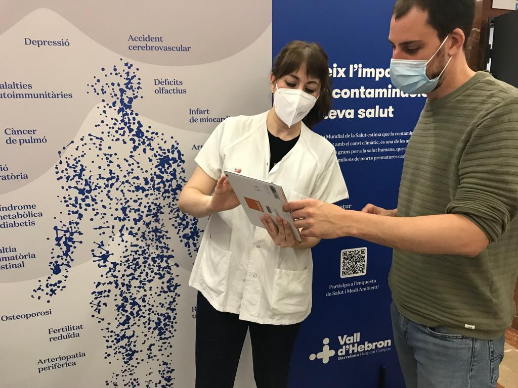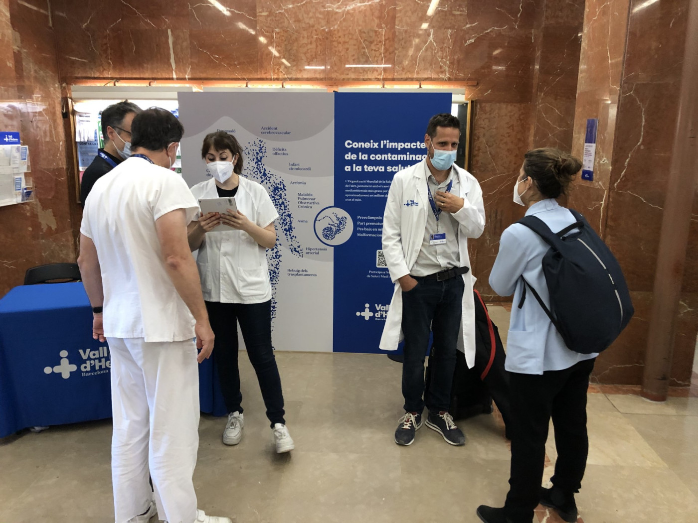 Durant tot el matí, membres de la Comissió han explicat amb l’ajuda dels plafons a pacients, acompanyants i professionals els perills de la contaminació mediambiental, com ara la qualitat de l’aire o el soroll, i els han animat a respondre una enquesta feta per la pròpia Comissió per copsar el grau de coneixement de la població sobre aquesta problemàtica. “Volem saber què sap, què pensa i què preocupa a la població sobre els riscos de la contaminació, inclosos els sanitaris, que són els professionals que han de transferir als pacients l´evidència científica dels efectes nocius de la  contaminació i potencials mesures de prevenció. Per exemple, podem recomanar a determinats pacients que els dies amb pics de contaminació no surtin a fer exercici per la ciutat o que passin el temps lliure en zones verdes”. El Dr. Jordi Bañeras apunta el doble benefici de fer accions com desplaçar-se en bicicleta o caminar, que permet fer salut i alhora contribuir a contaminar menys: “Caminar cada dia disminueix el risc cardiovascular”.