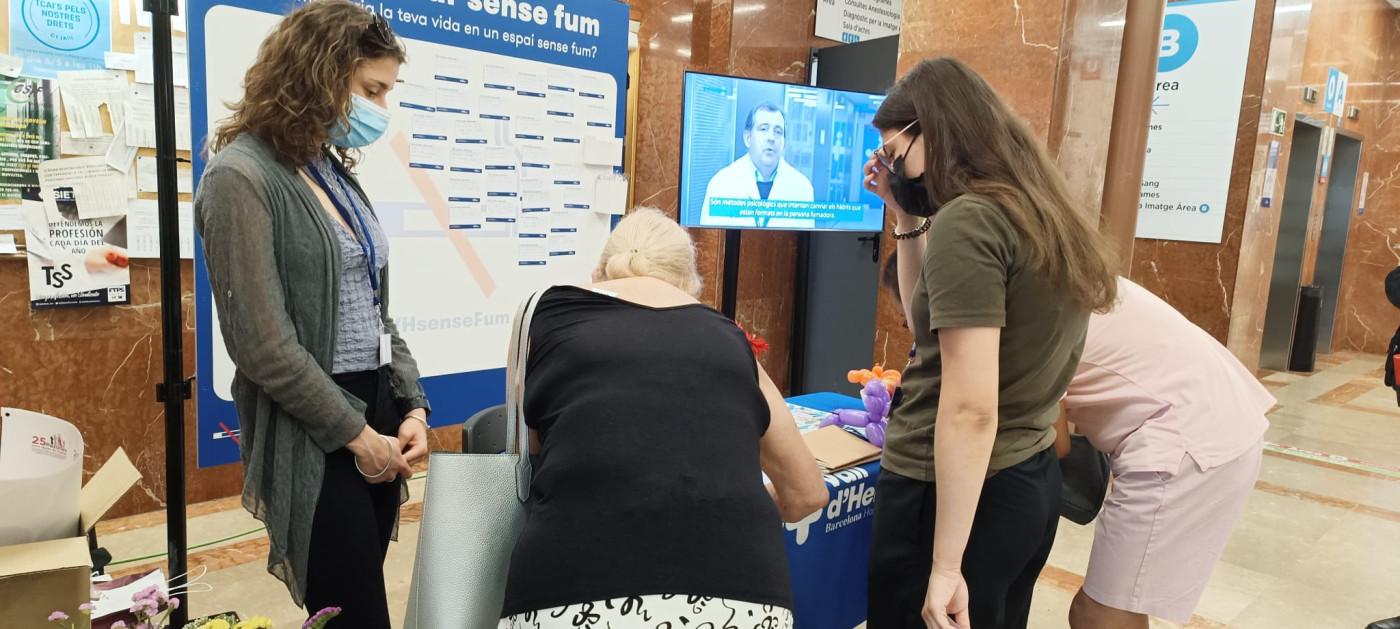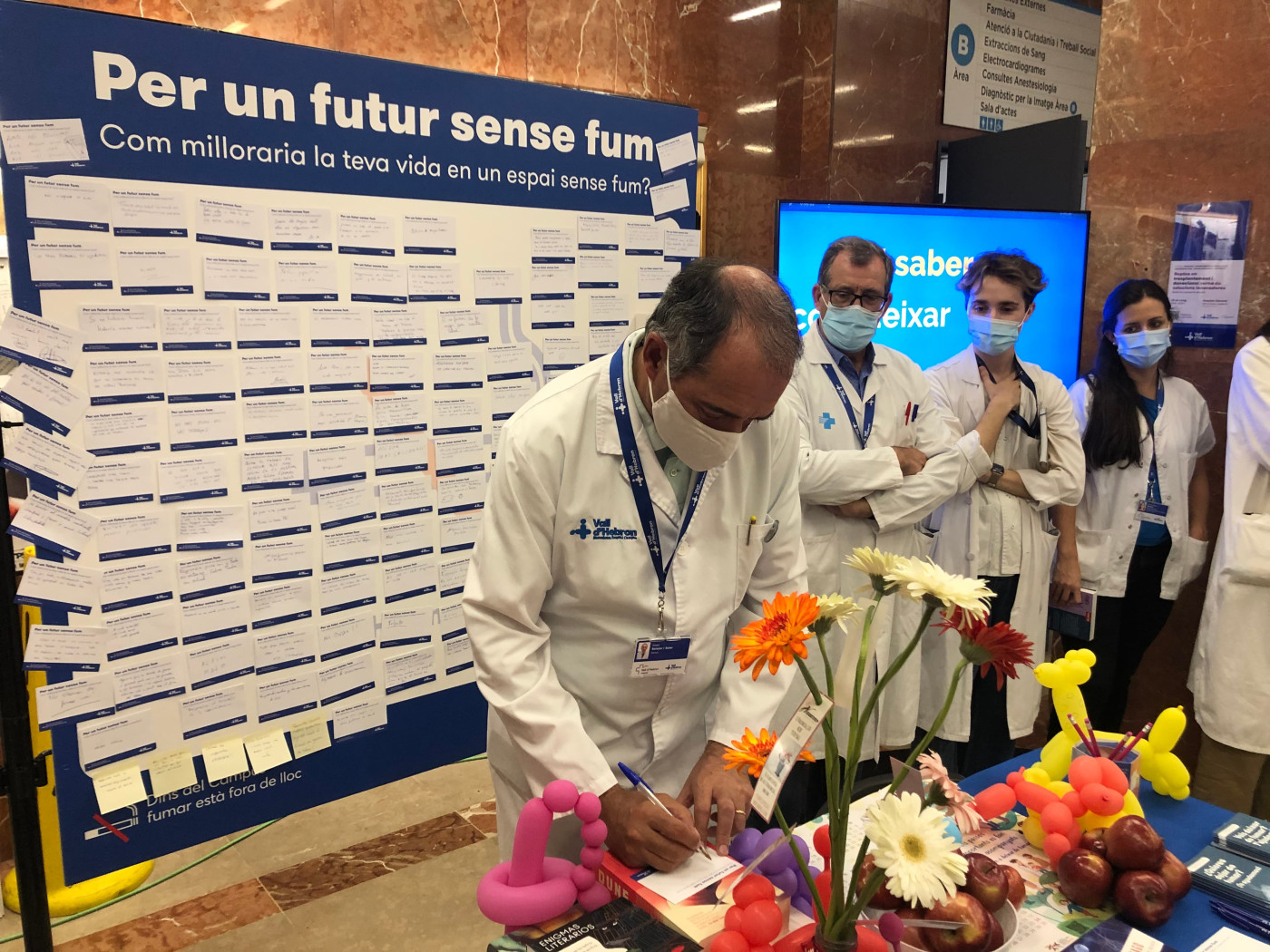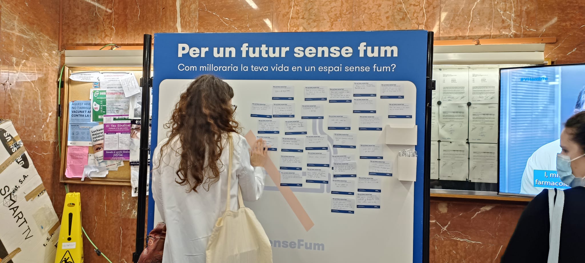 Els membres de la Comissió Sense Fum del Campus han animat a tothom, pacients, professionals i acompanyants, a escriure un missatge en uns plafons situats als vestíbuls explicant com s'imaginen un futur sense tabac.