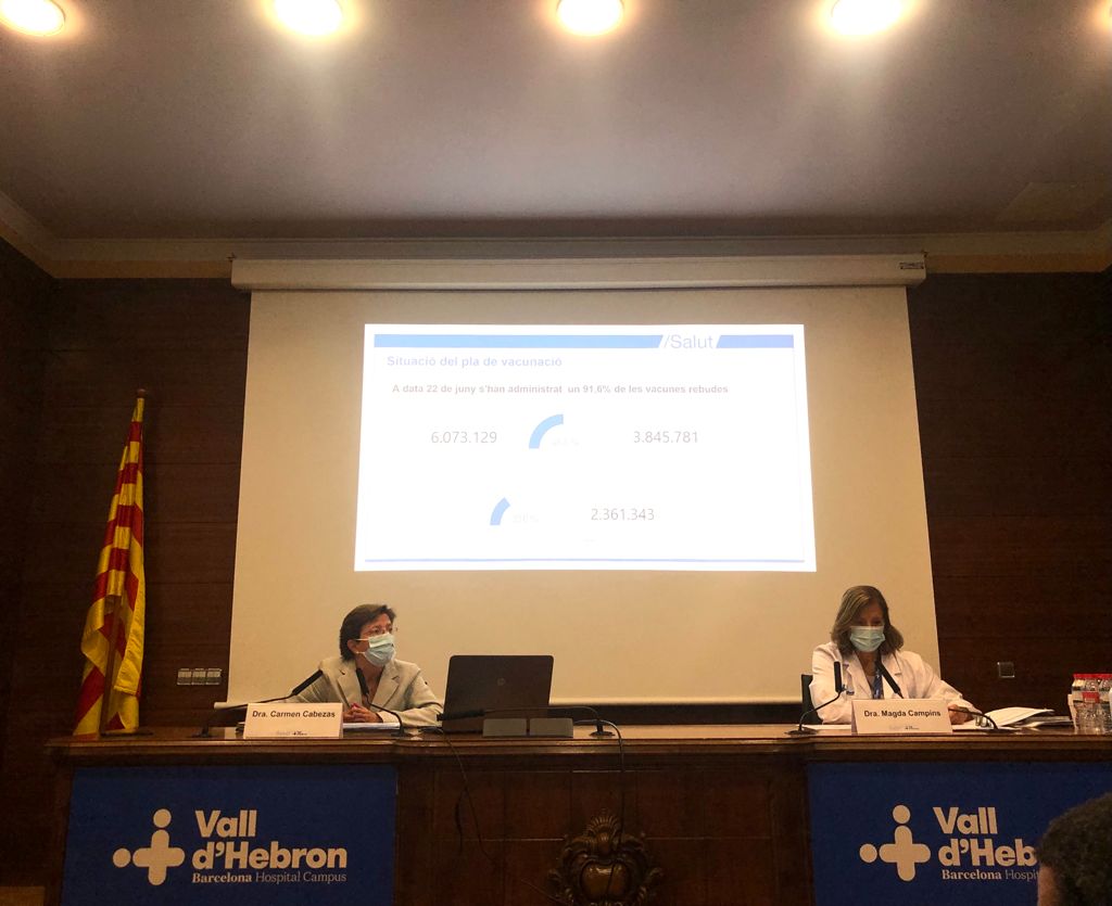 L'habitual roda de Premsa per informar sobre el ritme de la vacunació enfront la COVID-19 a Catalunya s'ha fet avui des de l'Hospital Universitari Vall d'Hebron. La Dra. Magda Campins, cap de Medicina Preventiva i Epidemiologia de Vall d'Hebron, ha acompanyat a la Dra. Carmen Cabezas, secretària de Salut Pública, per fer balanç de la vacunació enfront a persones d’alt risc ateses als hospitals catalans. Des del 16 de febrer, els 40 hospitals de Catalunya han administrat 274.718 dosis als pacients vulnerables. “Hi ha hagut una gran acceptació de la vacuna entre aquest grup de pacients d’alt risc”, ha destacat.