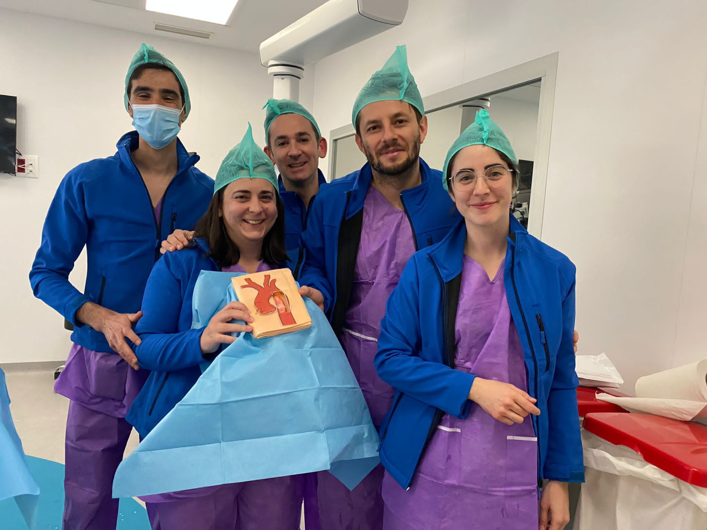El segon dia, es va comptar amb la participació del Dr. Diego Garcés, expert en Angiologia i Cirurgia Vascular i Endovascular, que exerceix a França. Va guiar els i les alumnes en una dissecció de cadàver, conservat amb una tècnica que es realitza a la Universitat Miguel Hernández d’Alacant, “thiel”, gràcies a la qual, els teixits es conserven intactes, no es degeneren i mantenen l’elasticitat d’una persona viva. En aquest curs, es fan servir per fer dissecció quirúrgica i després es retornen al centre d’origen per a una altra formació. A la tarda, van enfrontar-se a un altre repte: implantar a l’estabulari unes pròtesis amb patologia aneurismàtica fetes amb impressió 3D, per tractar la patologia amb tècniques endovascular, col·locant un stent-. Les pròtesis estan fetes a partir d’un model real per una empresa d’enginyeria, BCBC Engineering. Va ser una prova a contrarellotge en la qual els i les participants disposaven de 3,5 hores.
