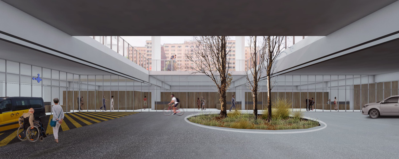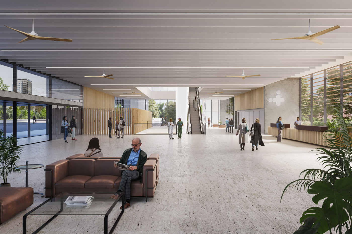 Amb una arquitectura innovadora i una situació estratègica, els despatxos d’arquitectura Nakamatsu Associats i Moran Arquitectura UTE han dissenyat aquest projecte. “L’espai urbà connectarà de forma directa i accessible el nou edifici i la resta del Campus Vall d’Hebron. Com es tractarà d’una nau diàfana sense pilars, flexible i adaptable, podrà canviar, créixer i adaptar-se en el futur”, explica l'arquitecte Diego Nakamatsu. L’edifici està dissenyat per tal d’optimitzar el flux de pacients i professionals. Les consultes externes, gabinets d’exploració i hospitals de dia es plantegen amb amplis espais, autèntiques places d’espera amb llum i ventilació natural i amb vistes al mar i a Barcelona. Els grans patis bioclimàtics permetran l’entrada de llum natural. Les mesures de producció i d’estalvi d’energia aplicades a l’edifici segueixen el model d’arquitectura conscient, respectuosa, sostenible i verda.