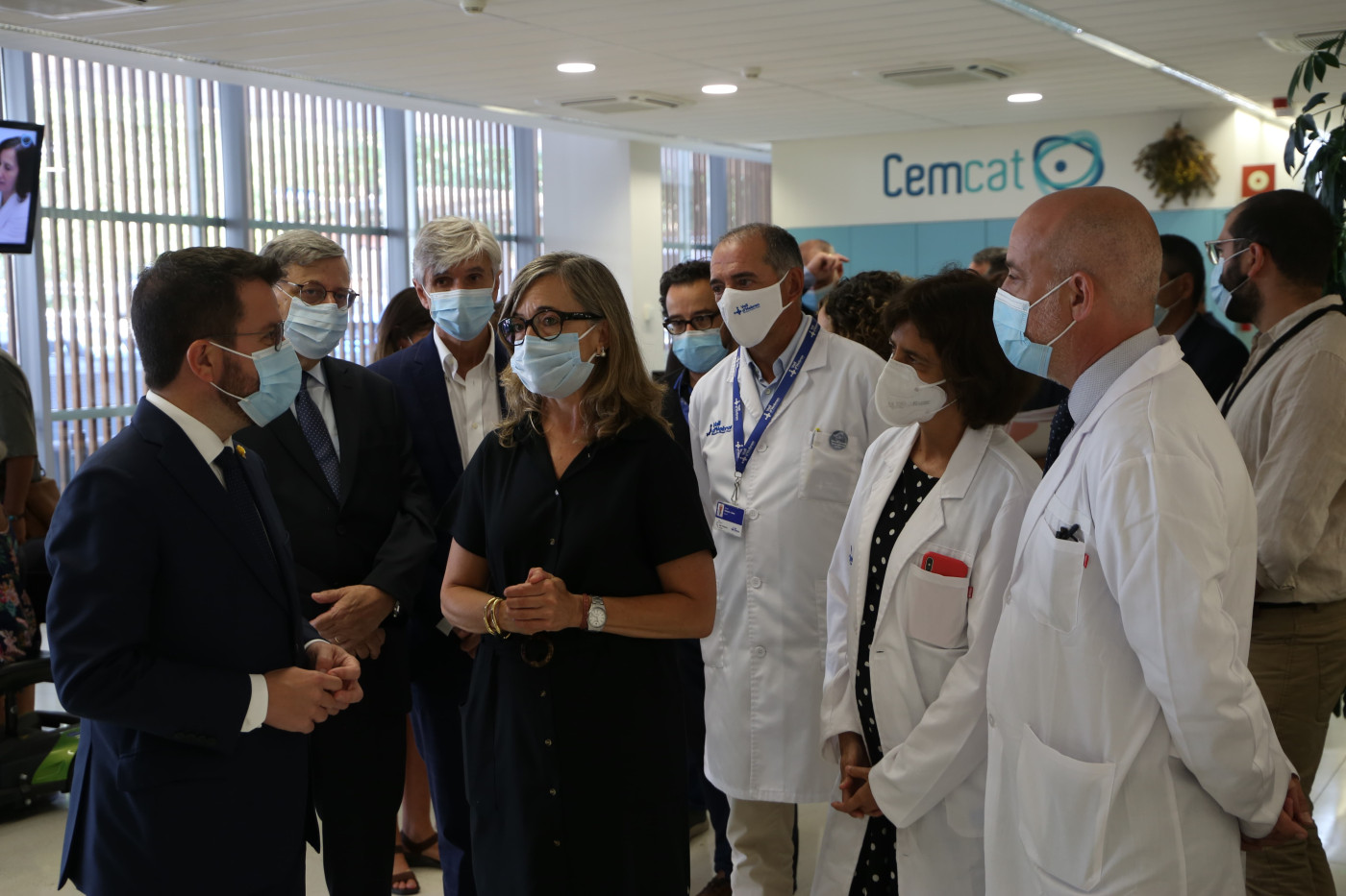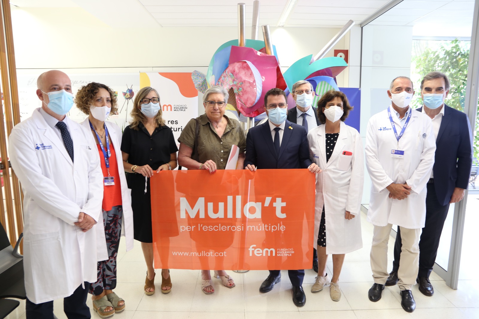 El president de la Generalitat, Pere Aragonès, i el conseller de Salut, Josep Maria Argimon, han visitat avui Vall d'Hebron Barcelona Hospital Campus per conèixer de primera mà l’atenció integral a les persones amb esclerosi múltiple que porten a terme el Servei de Neurologia de Vall d’Hebron, el Centre d’Esclerosi Múltiple de Catalunya (Cemcat) i la Fundació Esclerosi Múltiple (FEM). El Dr. Albert Salazar, gerent de l’Hospital Universitari Vall d’Hebron, Mari Àngels Barba, directora d’Infermeria de l’Hospital Universitari Vall d’Hebron, el Dr. Jaume Sastre-Garriga i la Dra. Mar Tintoré, subdirector i responsable assistencial del Cemcat respectivament, a més de neuròlegs de l’Hospital Universitari Vall d’Hebron, la presidenta de la Fundació Esclerosi Múltiple de Catalunya (FEM), Maria José Abella, i la directora de la FEM, Rosa Masriera, els han acompanyat durant el seu recorregut per les instal·lacions del Cemcat i els han explicat la tasca que els professionals sanitaris porten a terme per millorar la qualitat de vida dels pacients amb esclerosi múltiple, una malaltia neurodegenerativa i crònica del sistema nerviós central, sovint generadora de discapacitat, que a Catalunya pateixen 139 pacients per cada 100.000 habitants.