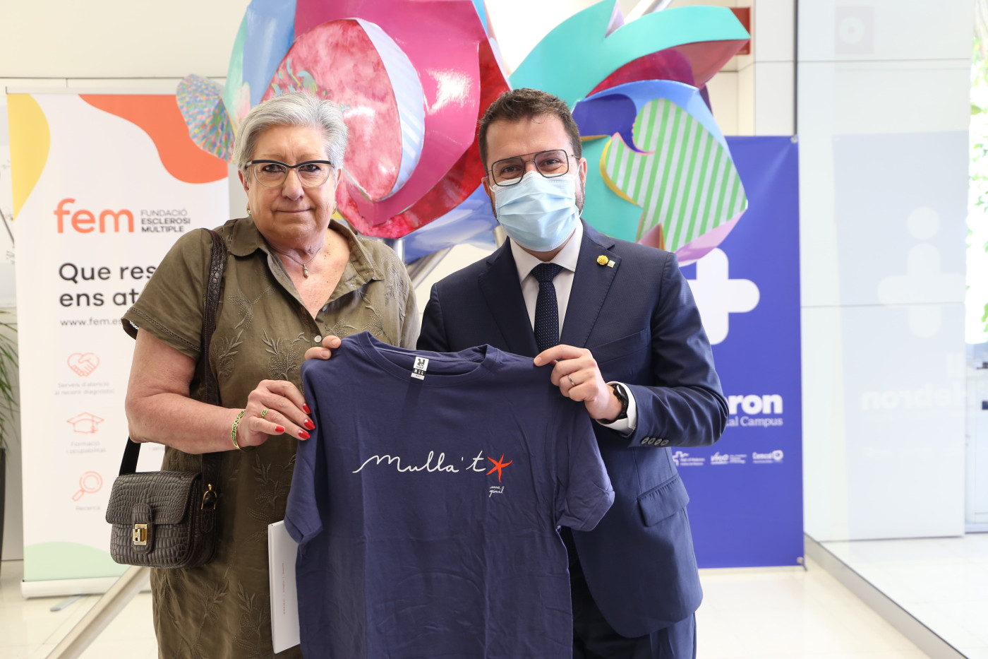 Un cop acabada la reunió, el president Pere Aragonès i el conseller de Salut, Josep Maria Argimon, han visitat al Cemcat les consultes de psicologia i neuropsicologia, el gimnàs, l’espai de vida independent de l’aula, així com les consultes mèdiques, l’àrea d’assajos clínics i l’Hospital de Dia. En acabar la visita, el president Pere Aragonès ha rebut una samarreta Mulla’t per l’esclerosi múltiple, un dels productes solidaris amb els quals pots contribuir a impulsar la recerca i a millorar la qualitat de vida dels pacients amb esclerosi.