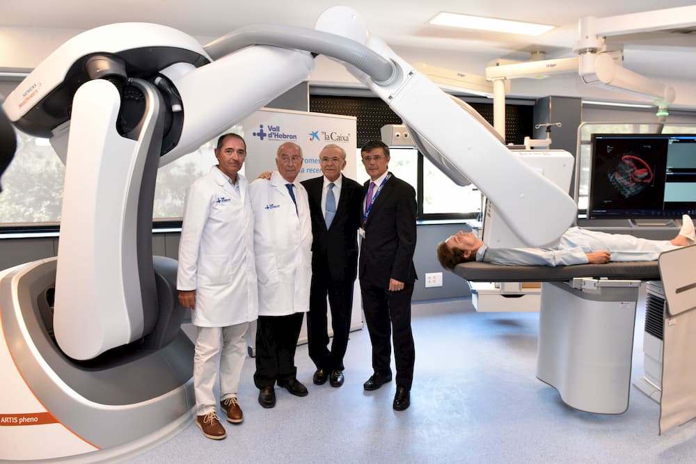Isidre Fainé, president de la Fundació Bancària ”la Caixa”; el Dr. Josep Ramon Armengol Miró, director de Vall d’Hebron-Wider Barcelona; el Dr. Albert Salazar, gerent de l’Hospital Universitari Vall d’Hebron, i el Dr. Joan X. Comella, director del Vall d’Hebron Institut de Recerca (VHIR), han signat avui un conveni de col·laboració que permetrà la incorporació del robot Artis Pheno de Siemens al Servei d’Endoscòpia Digestiva Vall d’Hebron-Wider Barcelona, així com l’ampliació d’aquest. L’acte de signatura també ha comptat amb l’assistència del director general de la Fundació Bancària “la Caixa”, Jaume Giró, i una representació del personal mèdic de l’hospital.