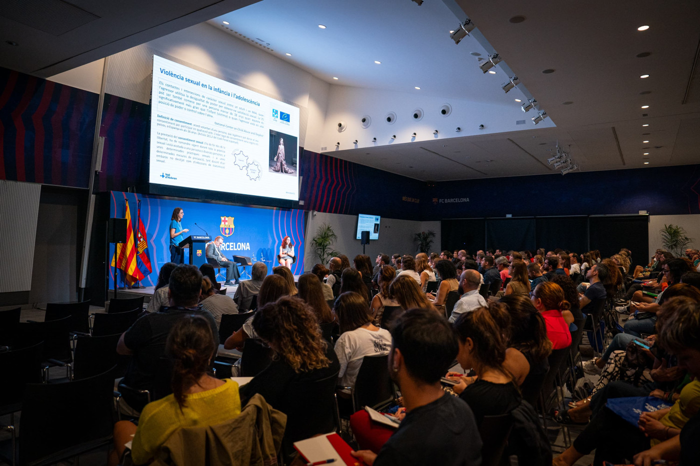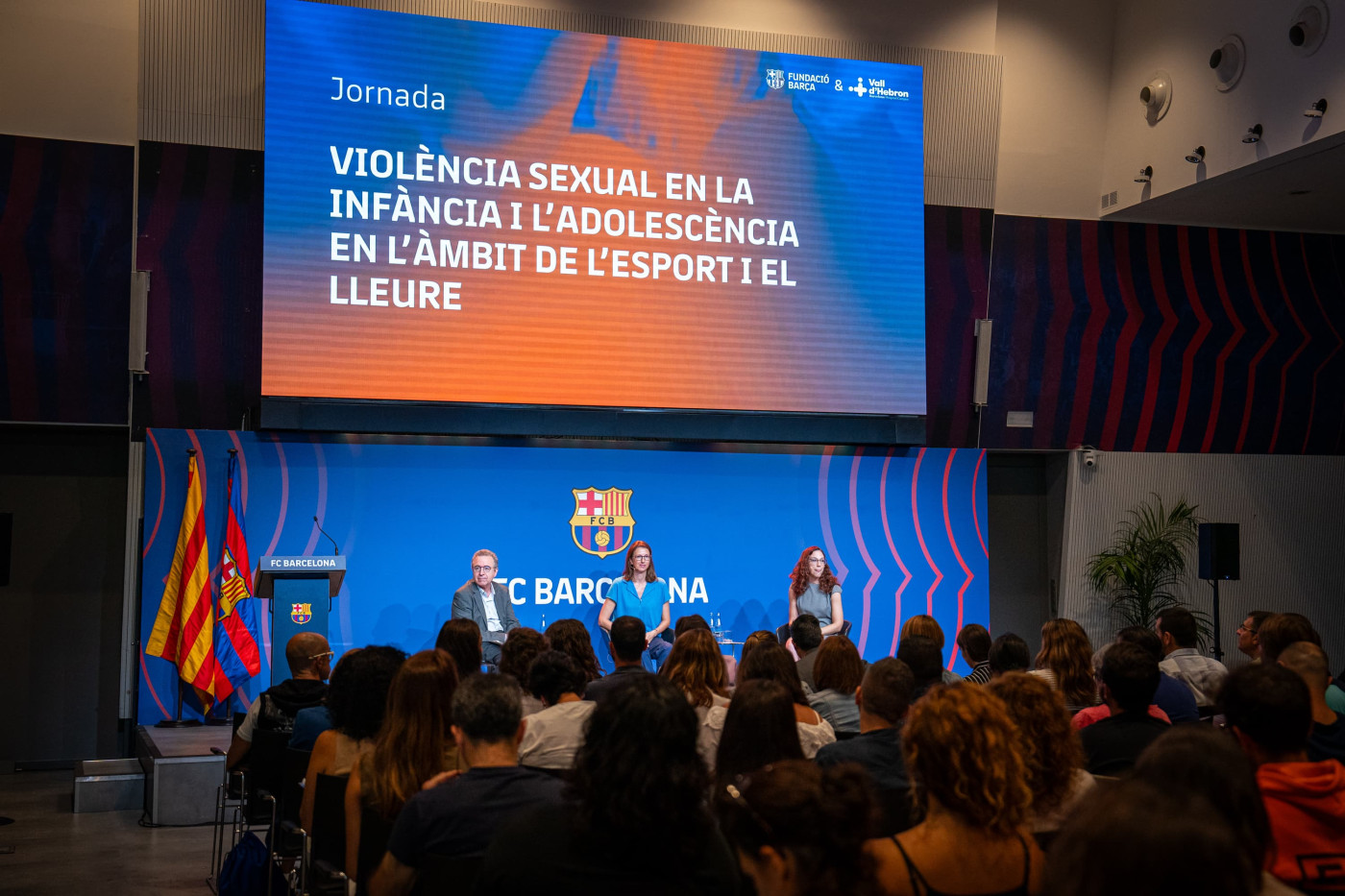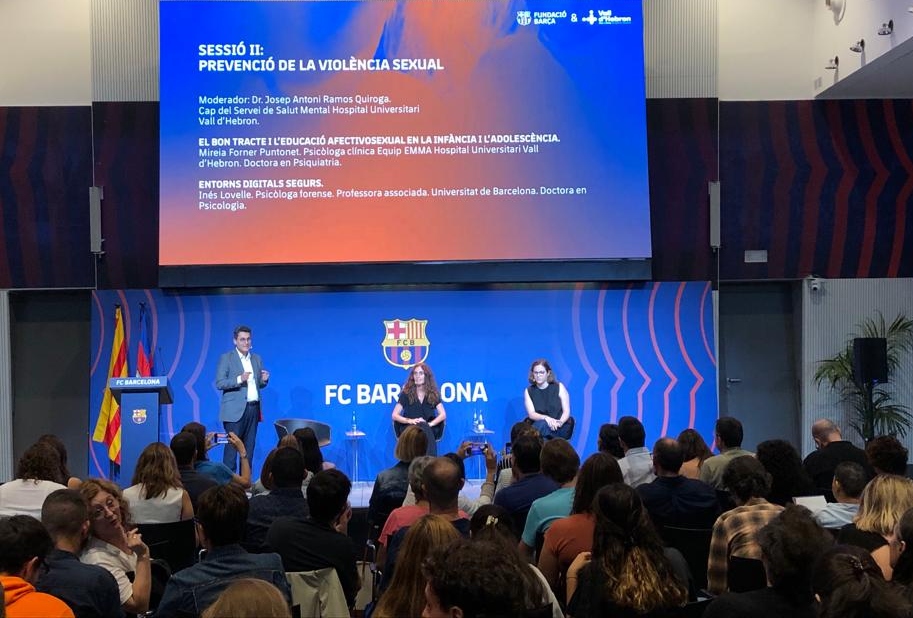Més de 200 persones de l’àmbit esportiu, del lleure i de l’educació s’han reunit avui a l’Auditori 1899 de l’Spotify Camp Nou en una jornada dedicada a la violència sexual en la infància i l’adolescència en l’àmbit de l’esport i el lleure organitzada per la Fundació FC Barcelona i la Unitat d’Atenció a les Violències vers la Infància i l’Adolescència (Equip EMMA) de l’Hospital Universitari Vall d’Hebron.