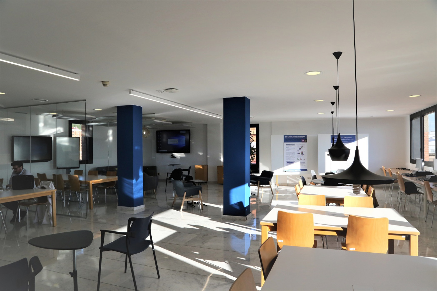 També l’espai físic s’ha organitzat en funció de les noves necessitats dels usuaris, creant així diferents zones per donar cabuda a diferents activitats. Ara hi ha una àrea d’estudi amb capacitat per a 14 persones; i una altra zona de treball individual, amb 9 ordinadors personals i 3 punts per treballar amb ordinador portàtil. En una altra secció hi ha cinc taules amb espai per 4 persones cadascuna, per a treballar en grup.