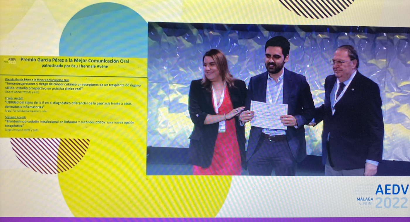Els organitzadors del 49è Congrés Nacional de l'Acadèmia Espanyola de Dermatologia i Venereologia van premiar l’estudi presentat pel Dr. Álvaro Gómez-Tomás, membre del Servei de Dermatologia i col·laborador de la consulta monogràfica de seguiment dermatològic de pacients receptors d'un trasplantament d'òrgan sòlid de l'Hospital Universitari Vall d'Hebron, liderada per la Dra. Carla Ferrándiz-Pulido. El doctor va rebre el premi a la millor comunicació del congrés pel treball que avalua el paper dels diferents règims immunosupressors que reben els pacients trasplantats en el risc de desenvolupar càncer de pell, una de les complicacions més freqüents en aquest segment de població.