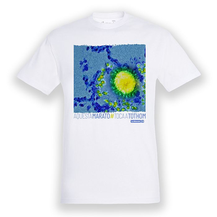 La imatge seleccionada ve acompanyada del missatge #TocaATothom i vol sensibilitzar sobre la importància de la recerca per desenvolupar tractaments contra la COVID-19 i altres malalties. És la primera vegada que La Marató de TV3 edita una samarreta solidària. Es pot comprar a partir d’avui a la botiga online de TV3 i Catalunya Ràdio, en models per a adults o per a infants, i els fons que es recaptin es destinaran al marcador de La Marató per la investigació de la COVID-19.