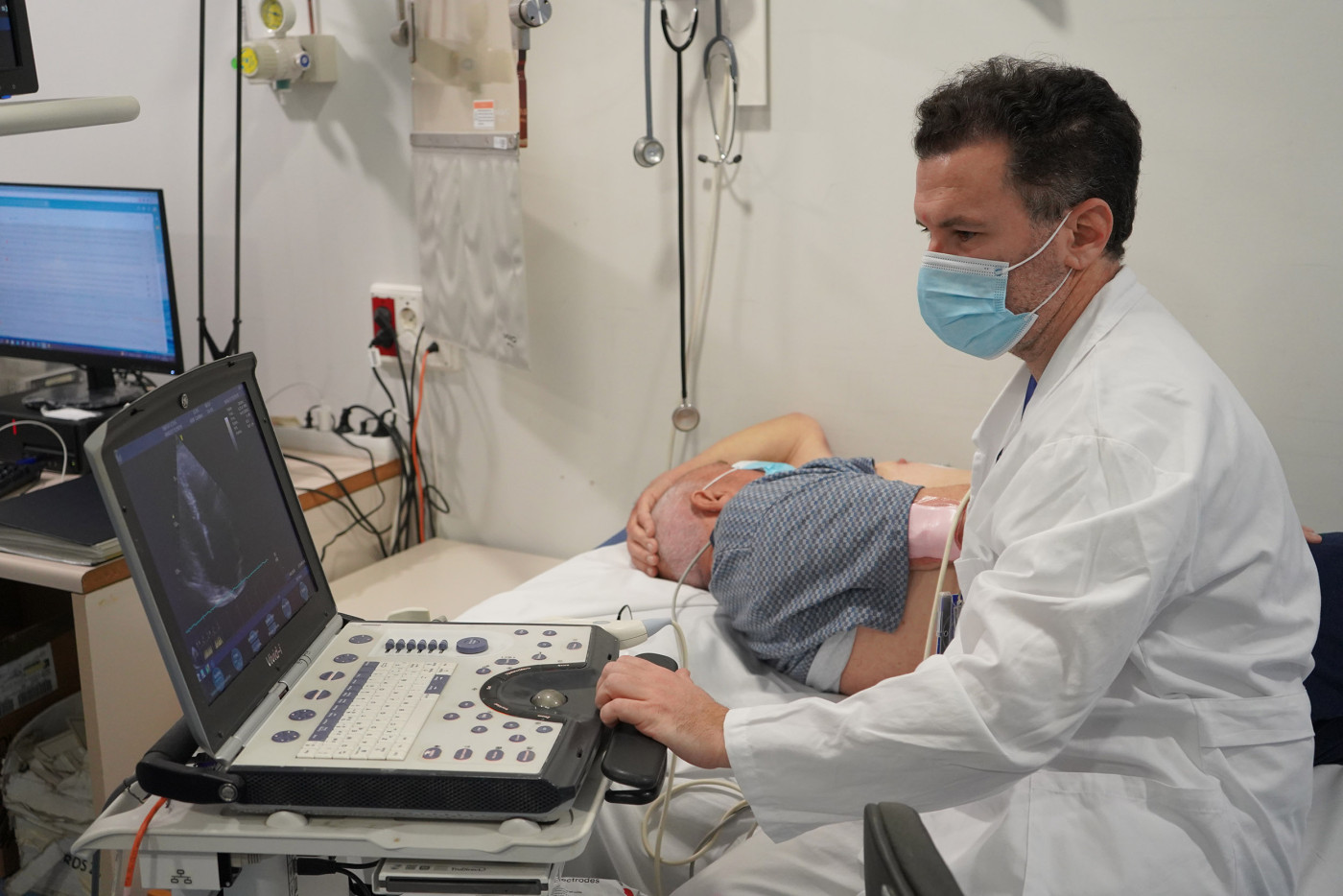 Dr. Jorge Pagola fent una ecografia cardíaca a un pacient d'ictus.