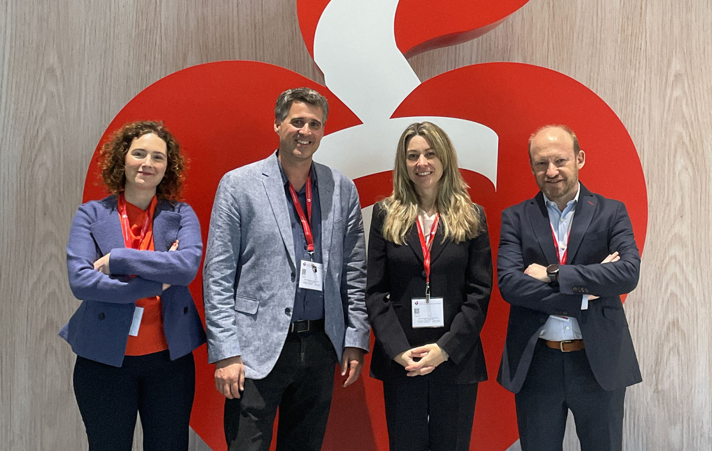 Mª Eugenia Zarabozo, cofundadora d'aptaTargets, Dr. Marc Ribó, neuròleg intervencionista de Vall d'Hebron, Dra. Macarena Hernández, CSO d'aptaTargets, i David Segarra, CEO i cofundador d'aptaTargets, a la ISC.