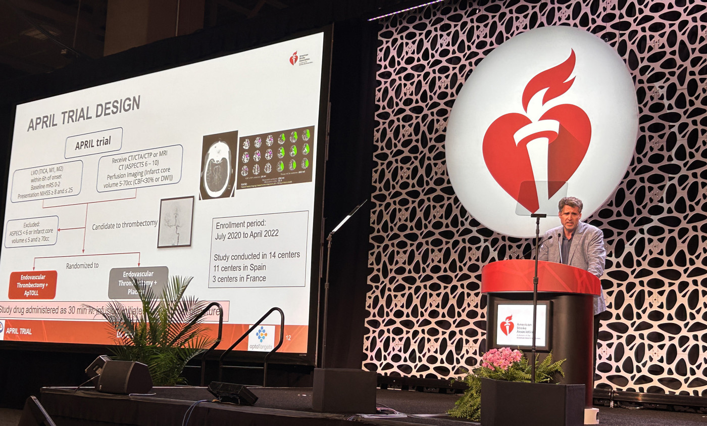 APRIL s’ha dissenyat com un assaig multicèntric, doble cec, aleatoritzat i controlat amb placebo, en el qual han participat 151 pacients, homes i dones de 18 a 90 anys, de 14 hospitals de referència en recerca i assistència de malalties neurovasculars a Espanya i França (*). Els pacients es van assignar aleatòriament al tractament amb ApTOLL per via intravenosa a dues dosis diferents o placebo. Tots els pacients de l’estudi van ser sotmesos a trombectomia mecànica, amb agent trombolític o sense, d’acord amb les guies clíniques.