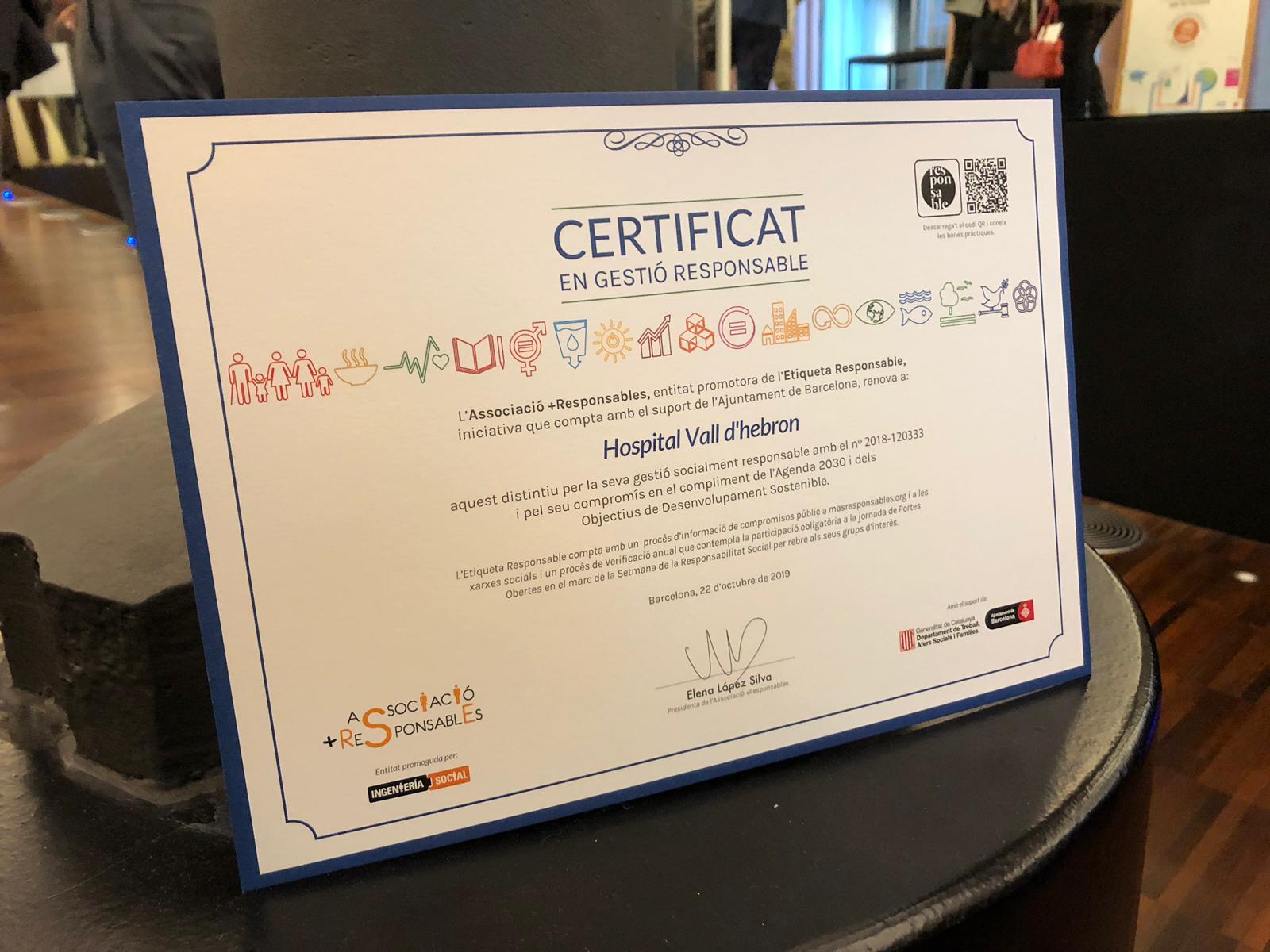L'Etiqueta Responsable certifica que l’entitat en qüestió acredita una gestió amb bones pràctiques de RSC. En el cas de Vall d’Hebron s’ha reconegut el seu model de gestió i compromís amb la societat més enllà de l’estricta assistència sanitària, en la recerca del benestar dels pacients i els seus familiars, així com en l’apoderament dels professionals.