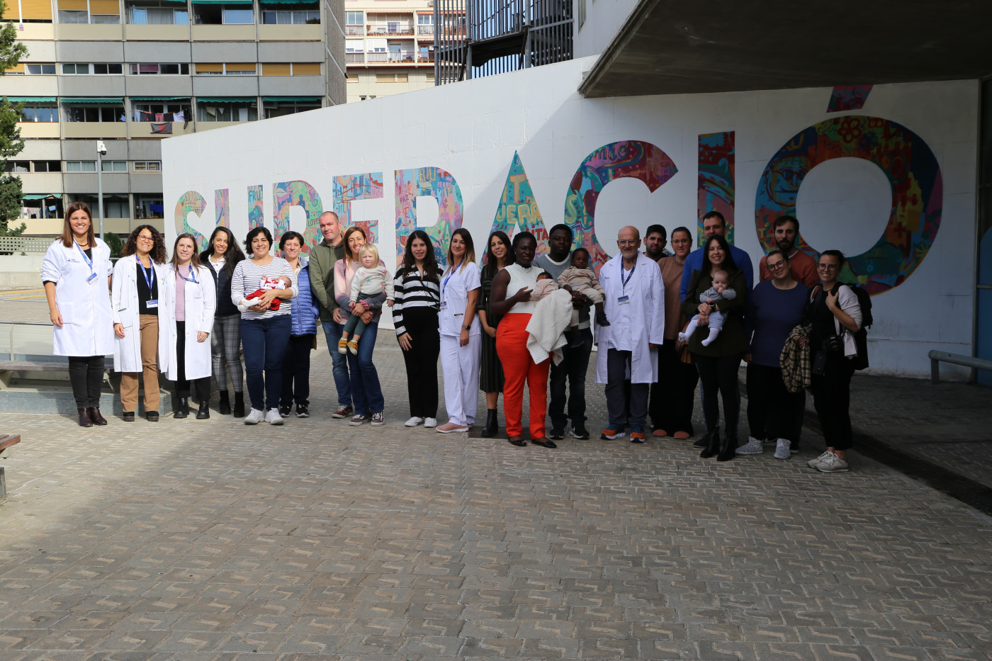 Cuando se diagnostica insuficiencia cervical uterina y la mujer quiere quedarse embarazada, se puede hacer lo que se llama un cerclaje vaginal, que consiste en suturar por vía vaginal el cuello uterino con algún tipo de material (como hilo sintético o una banda de poliéster) para reforzarlo. Por lo tanto, el cuello del útero queda cerrado de forma mecánica y no se dilata ni se debilita. Pero hay pacientes que tienen un cuello del útero tan débil que esta sutura no sirve. Entonces, es necesario hacer un cerclaje abdominal, una cirugía compleja antes del embarazo. Vall d'Hebron es referente en estas cirugías que comenzó a realizar en mayo de 2019. Desde entonces, ha intervenido a 16 mujeres que forman parte de una gran familia. La Dra. Maria Goya, responsable de la Unidad de Prevención del Parto Preterme del Servicio de Obstetricia, las ha reunido en el marco del Día del Prematuro. Todas comparten historias de pérdida, duelo y superación. Como Priscila. Después de perder cinco hijos, llegó a manos de la Dra. Maria Goya. Es la primera mujer que gracias a la técnica del cerclaje abdominal ha tenido dos hijos: Víctor y Luca. Priscila, Yanka, otras madres y siete bebés nacidos gracias a esta técnica y los profesionales se han hecho una fotografía de familia después de compartir sus experiencias.