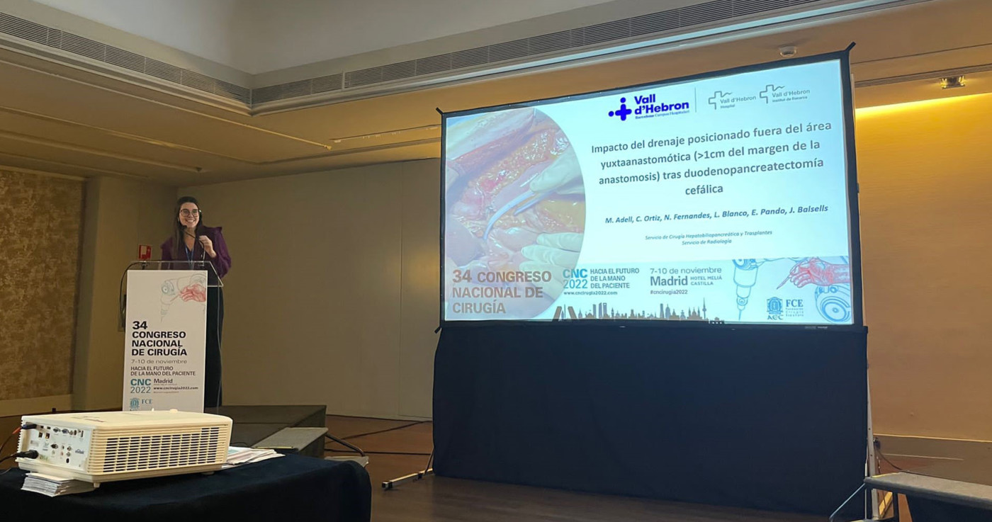 Entre los temas tratados también se encuentra el análisis del impacto de la colocación del drenaje después de una duodenopancreatectomía cefálica, en que se extirpa la cabeza del páncreas y el duodeno y que es uno de los tratamientos para el cáncer de páncreas. El uso de drenajes después de la cirugía es una práctica fácil y recomendada para evitar complicaciones como la fístula pancreática postoperatoria clínicamente relevante (FFPO-CR). El proyecto presentado en el congreso por la Dra. Montse Adell, cirujana residente del Servicio de Cirugía Hepatobiliopancreática y Trasplantes del Hospital Vall d’Hebron e investigadora del Vall d’Hebron Instituto de Investigación (VHIR), muestra que la posición del drenaje separada más de un centímetro de la zona de unión del páncreas con el intestino se relaciona con una mayor incidencia de FFPO-CR y otras complicaciones graves.