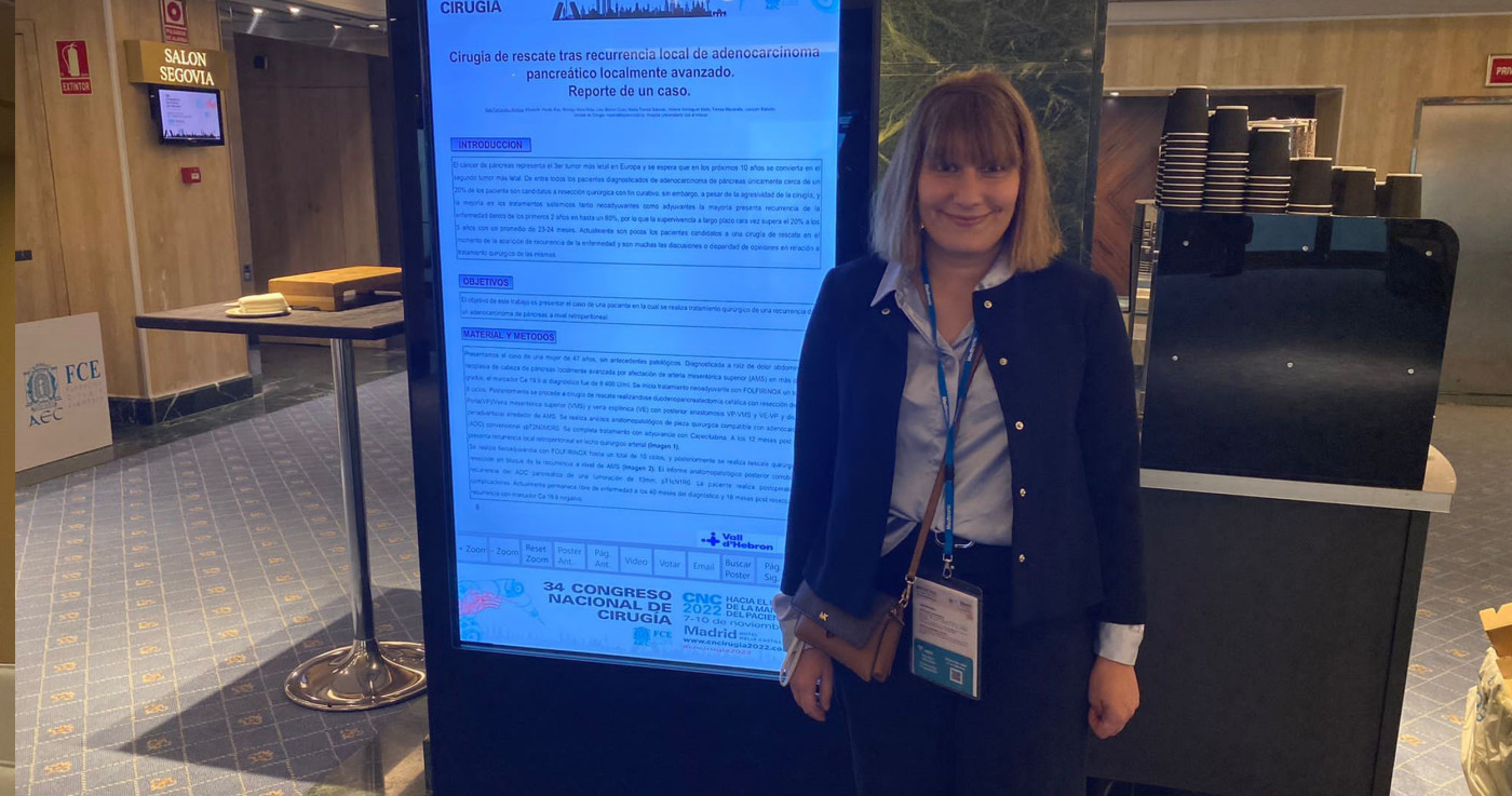 La Dra. Fernandes también lidera un póster en que se presenta un caso clínico de una paciente con adenocarcinoma de páncreas. Este tipo de tumor tiene baja superviviencia y hasta un 80% de los pacientes que son operados tienen una recidiva de la enfermedad en los primeros 2 años, y la gran mayoría no pueden volverse a operar. El equipo expone en este trabajo el caso de una paciente con recurrencia de un cáncer de páncreas un año después de la primera operación, que volvió a ser operada para eliminar el tumor. 18 meses después, la mujer, que recibió también quimioterapia como parte del tratamiento, continúa libre de enfermedad. Así, los investigadores consideran que el tratamiento quirúrgico de la recurrencia del adenocarcinoma de páncreas es una opción a valorar, ya que puede aumentar la supervivencia de los pacientes.