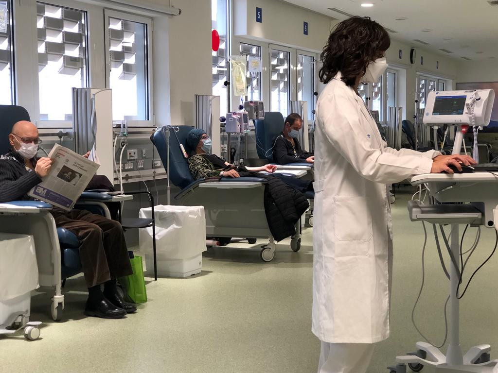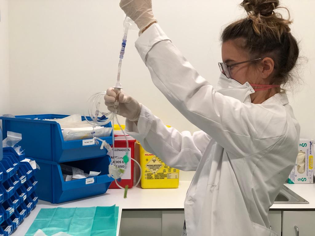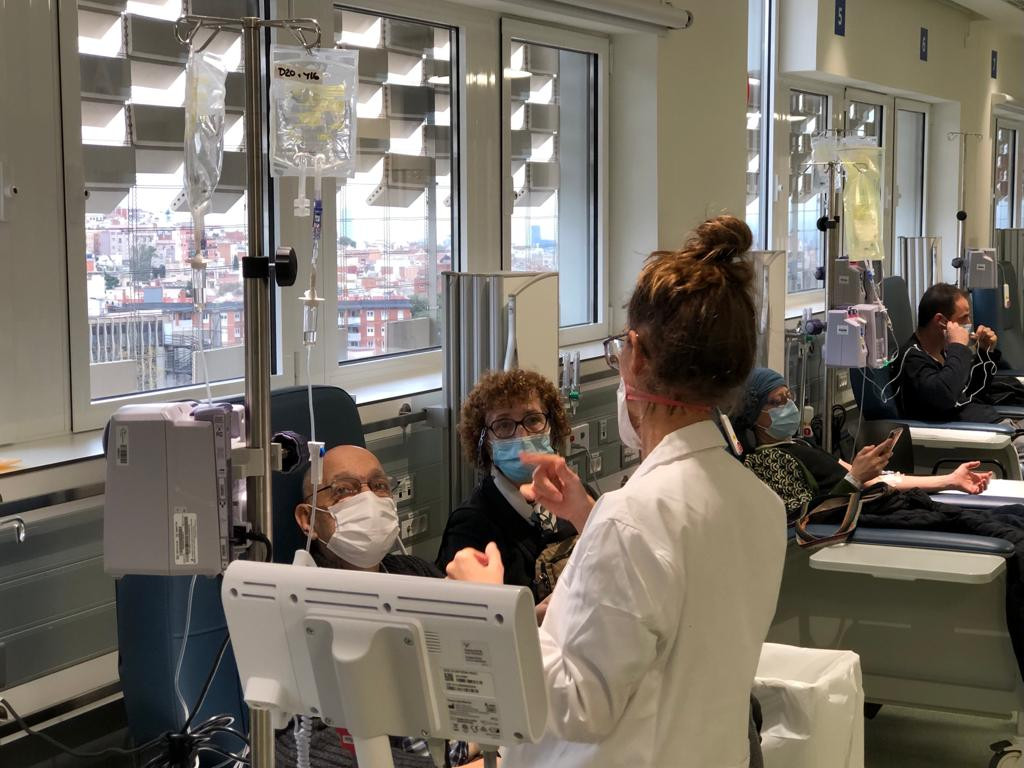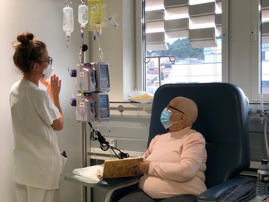 Los fármacos que reciben los pacientes en el Edificio Garbí se preparan en el Hospital General. Llegan en transporte especializado cada día a las 7.30 horas. “Preparamos y administramos los tratamientos siguiendo los mismos procedimientos y protocolos que en los hospitales de día ubicados en el Campus Vall d’Hebron”, añade Ángeles Peñuelas. Además del espacio diáfano donde los pacientes tienen opción de tener intimidad o interactuar, en el Hospital de Día de Oncología del Edificio Garbí hay una consulta de enfermería donde los y las pacientes pueden resolver dudas sobre dietas, hábitos saludables o qué hacer después del tratamiento de quimioterapia. También se realiza un seguimiento de las toxicidades y/o posibles efectos secundarios, igual como se hace en las otras consultas de enfermería oncológica.