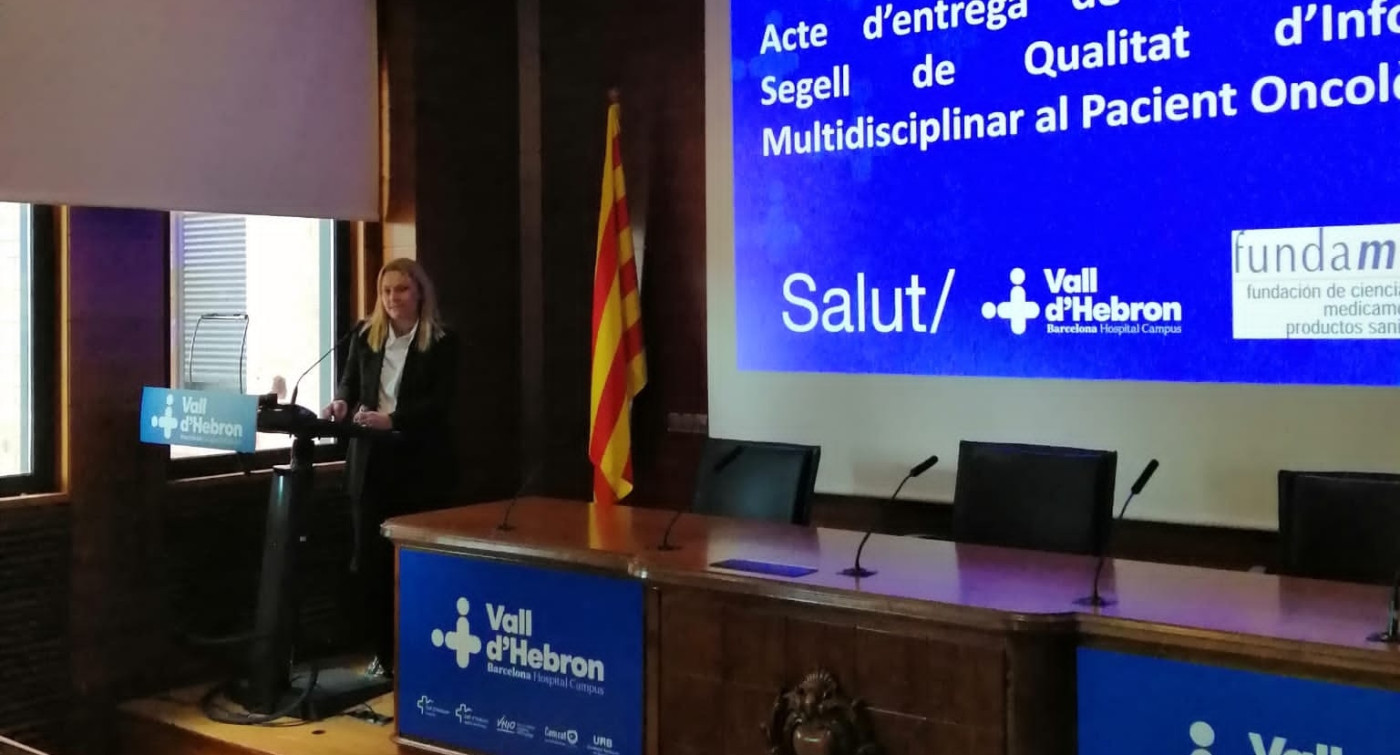 El Servicio de Farmacia del Hospital Universitari Vall d’Hebron ha recibido el Sello de Calidad en Información al Paciente con Enfermedades Oncológicas que otorga a los servicios de farmacia hospitalaria la Fundación Fundamed, avalado por la Sociedad Española de Farmacia Hospitalaria (SEFH) y cuenta con la colaboración de la Alianza General de Pacientes (AGP). Vall d’Hebron es el segundo centro del Estado que lo recibe después del Hospital General Universitario Gregorio Marañón de Madrid. El sello ha sido entregado en un acto celebrado esta mañana que ha contado con la presencia del Dr. Albert Salazar, gerente de Vall d’Hebron; Dra. Maria Queralt Gorgas, jefa del Servicio de Farmacia; Maria Josep Carreras, jefa de la Sección de Farmacia Oncohematológica; Marta Pérez, directora de Public Affairs y Comunicación de Fundamed; Paloma García del Moral, directora de calidad de Fundamed, y Vanesa Roig, Market Access director Iberia-BeiGene.