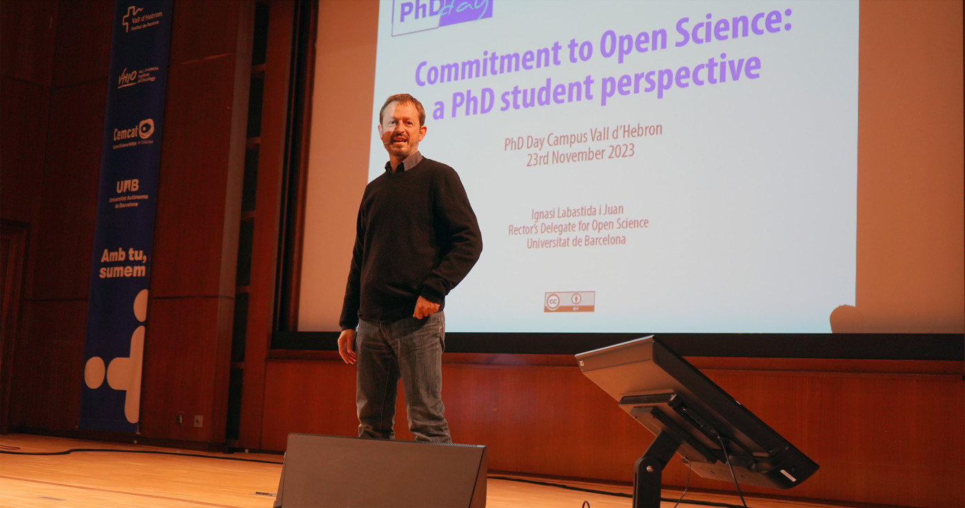 El acto también contó con expertos externos que se centraron en temas de gran interés para los estudiantes de doctorado. En primer lugar, el Dr. Ignasi Labastida, Jefe de la Unidad de Investigación del Centro de Recursos para el Aprendizaje y la Investigación (CRAI) de la Universidad de Barcelona (UB) y Jefe de la Oficina de Difusión del Conocimiento de la UB, habló sobre la importancia de la Ciencia Abierta. Compartió su experiencia como miembro de varios grupos de trabajo de Ciencia Abierta a nivel nacional e internacional. El Dr. Labastida destacó la importancia de una buena gestión de datos “es crucial tener un Plan de Gestión de Datos desde el principio, pero no uses una plantilla y acepta que no es únicamente un documento aislado, tiene que ser dinámico y adaptarse a la evolución del proyecto”.
