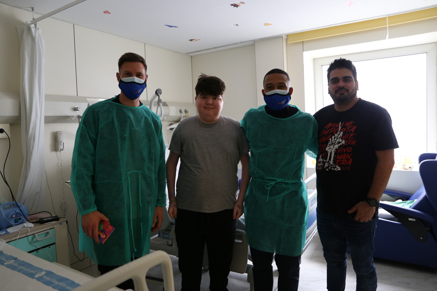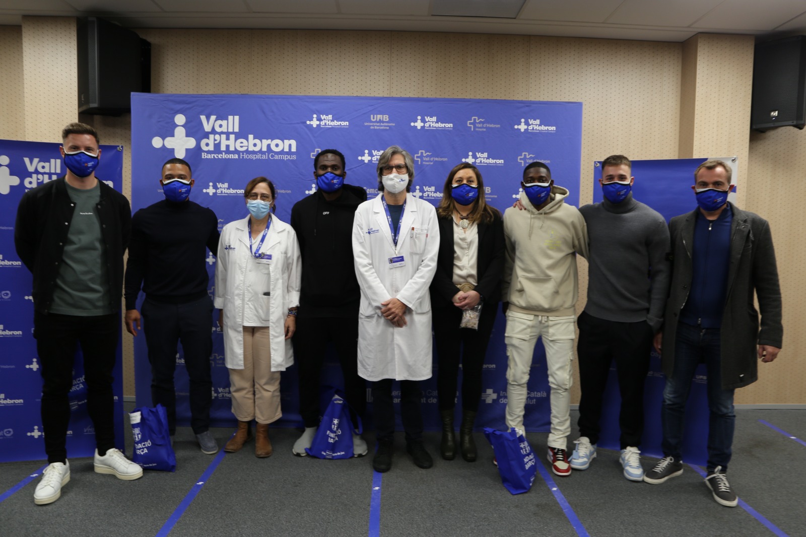 El portero del FC Barcelona, Marc ter Stegen; Ousmane Dembélé; Memphis Depay; Frank Kessié y el joven de Vic, Arnau Tenas, acompañados por el segundo entrenador del Barça, Òscar Hernández i Elena Fort, en nombre de la directiva, han repartido hoy mucha alegría en el Hospital Infantil de Vall d'Hebron.