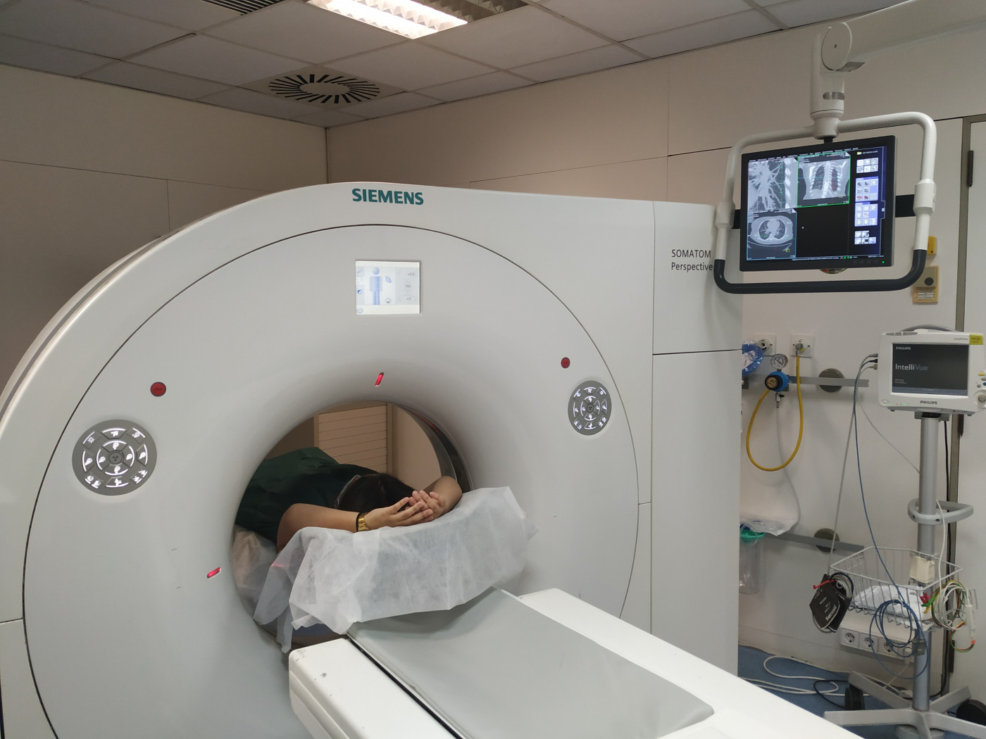 Cuando un paciente entra en el hospital con un cuadro sospechoso de COVID-19, un estudio que se le puede realizar es el TAC de tórax. El TAC permite ver el estado de los pulmones para comprobar si el paciente tiene neumonía, que es la principal complicación que provoca el coronavirus SARS-CoV-2. El procedimiento habitual es que un radiólogo comprueba de forma visual la imagen hecha por el TAC y hace un informe describiendo lo que detecta en los pulmones. Con este nuevo sistema en pruebas, la imagen se envía al mismo tiempo al software de inteligencia artificial, que hace un análisis y un diagnóstico inmediato a partir del TAC. Lo que Vall d’Hebron hará los próximos meses es comparar el informe del radiólogo con el análisis del software para evaluar el grado de concordancia.