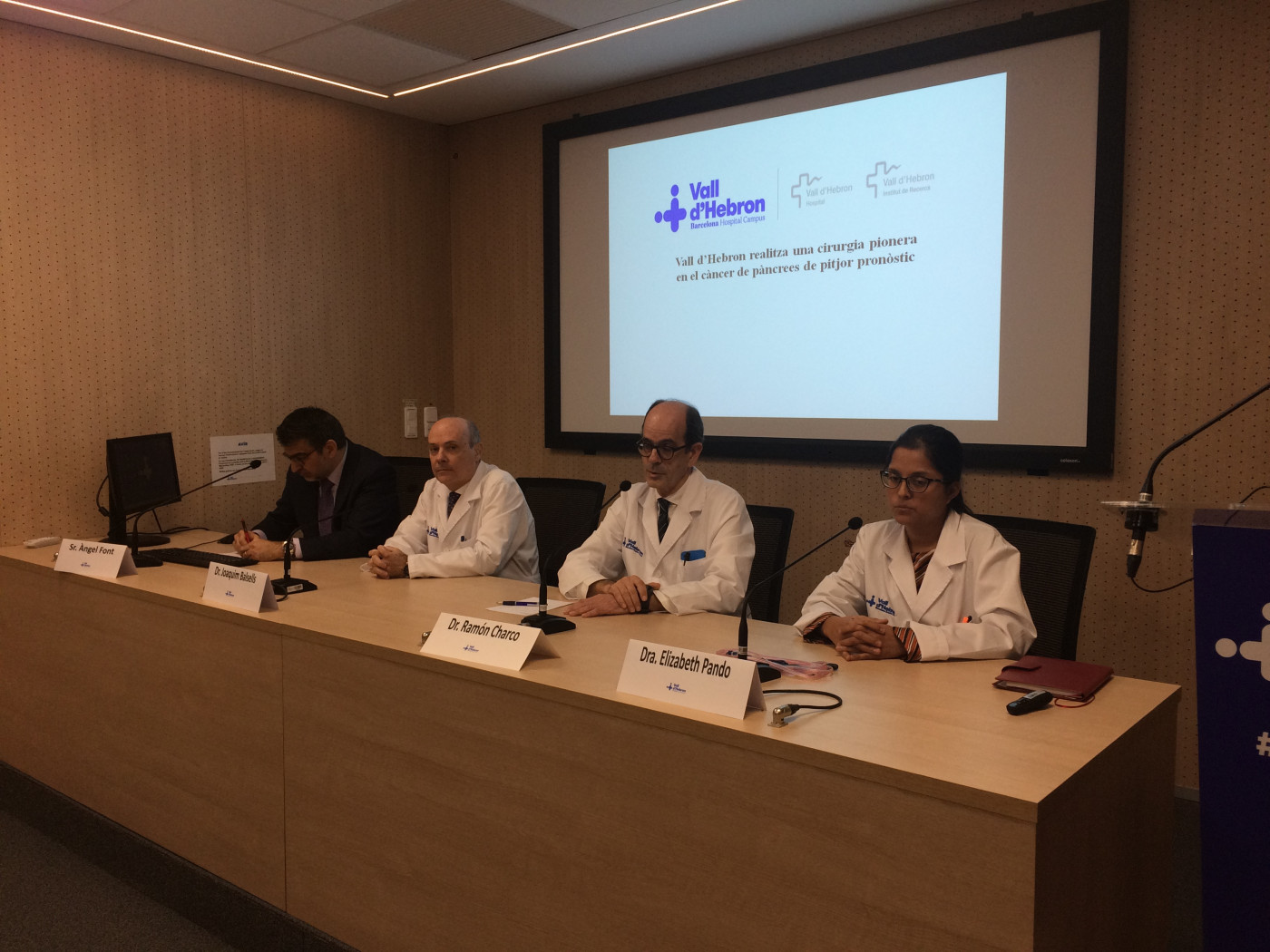 El Hospital Universitari Vall d’Hebron ha realizado la primera radiofrecuencia intraoperatoria en un adenocarcinoma de páncreas locamente avanzado del Estado. Este tipo de cáncer en estadio avanzado está considerado como el de peor pronóstico entre los tumores de páncreas, con una supervivencia media de 11 meses. A la rueda de prensa de presentación de la cirugía han asistido el Dr. Ramón Charco, jefe del Servicio de Cirugía Hepatobiliopancreática y Trasplantes y jefe del grupo de Trasplantes Digestivos del Vall d’Hebron Instituto de Investigación (VHIR); la Dra. Elizabeth Pando, del Servicio de Cirugía Hepatobiliopancreática y Trasplantes e investigadora del grupo de Trasplantes Digestivos del VHIR; el Dr. Joaquim Balsells, jefe clínico de Cirugía Pancreática e investigador del grupo de Trasplantes Digestivos del VHIR, y el Sr. Àngel Font, director corporativo del Área de Investigación y Estrategia de la Fundación Bancaria “la Caixa”.