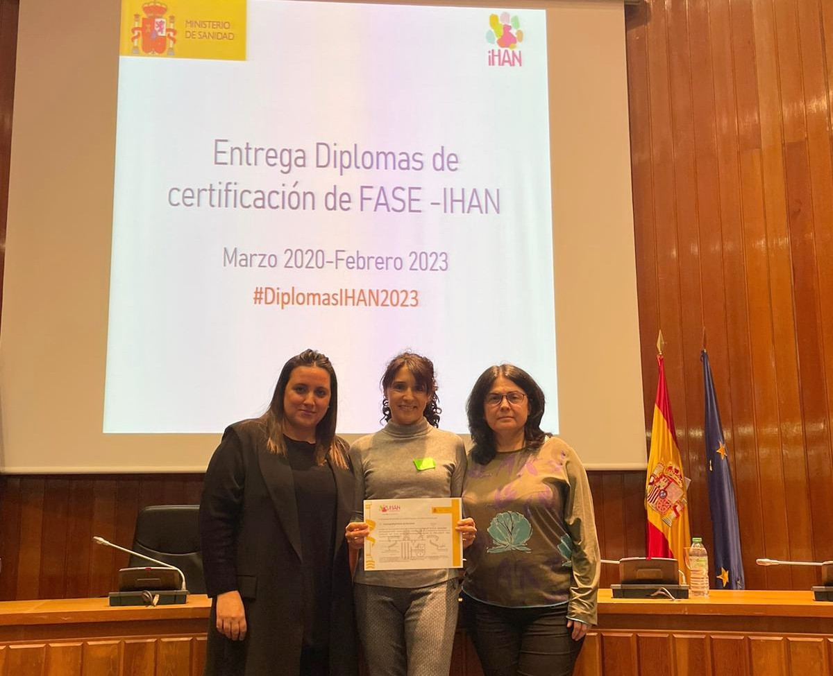 Representantes de la Subcomisión de Lactancia de Vall d’Hebron han recogido hoy en el Ministerio de Sanidad el certificado que acredita haber superado la Fase 1D (Fase de Descubrimiento) de la Iniciativa para la Humanización de la Asistencia al Nacimiento y la Lactancia (IHAN), una iniciativa promovida por la Organización Mundial de la Salud (OMS) y UNICEF. Un hospital o servicio de salud IHAN está comprometido con prácticas que protejan, promuevan y apoyen a la lactancia materna exclusiva desde el nacimiento. La acreditación IHAN se consigue después de haber superado un total de cuatro fases: Vall d’Hebron ya ha conseguido acreditar la primera. Este viernes la enfermera de Obstetricia Mª de Carmen El Ouahabi López, presidenta de Subcomisión de Lactancia Materna y Líder de Best Practices Spotlight Organitations (BPSO) de Lactancia Materna; la enfermera Supervisora de Obstetricia Carmen Márquez Romero i Mª Ángeles Aceituno López, adjunta a la Dirección de Enfermería de Vall d’Hebron, ambas miembros de la Subcomisión de Lactancia Materna, se han desplazado a Madrid a recoger el certificado al Ministerio de Sanidad.